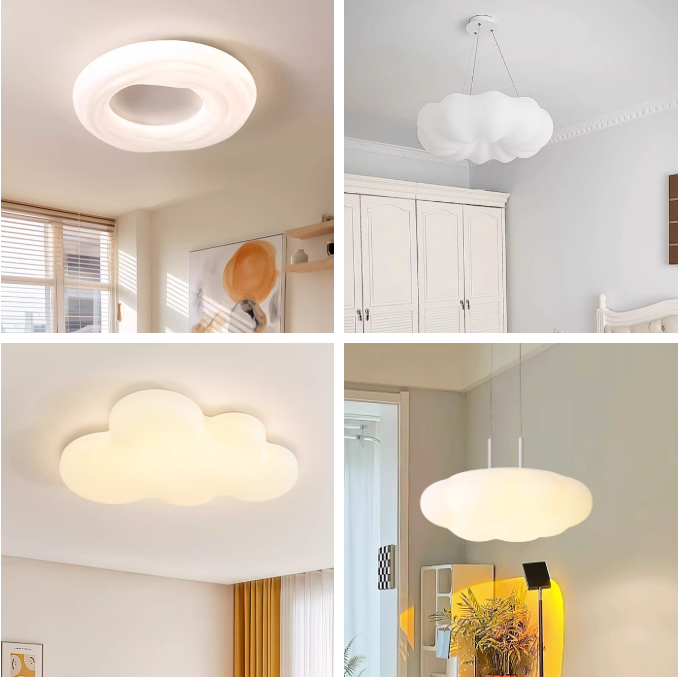 在燈具的選擇上,如果預(yù)算充足,就直接做無(wú)主燈,柔光為主,硬光為輔。如果預(yù)算低,就直接選木質(zhì)的造型燈,比如南瓜燈、曲奇燈、云朵燈等,色溫選3000 K到4000 K的更溫馨。