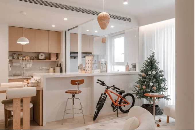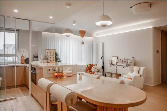客餐廚三區(qū)無縫銜接,開放式布局讓空間感倍增,小戶型也能享受大宅的開闊視野。溫暖的奶油色調(diào)搭配柔和燈光,營造出溫馨舒適的居家氛圍。
