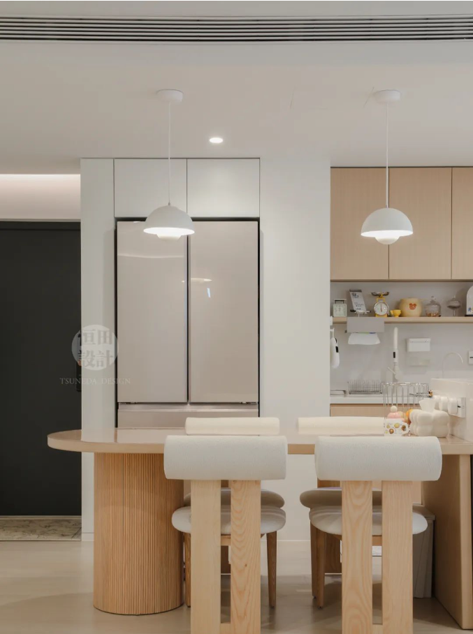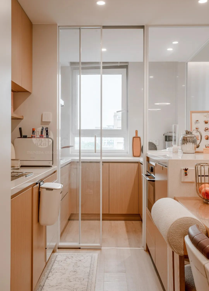用玻璃隔開中廚區(qū),視線無阻礙,交流、互動時刻發(fā)生。島臺內(nèi)凹20cm,用餐時會舒適很多。