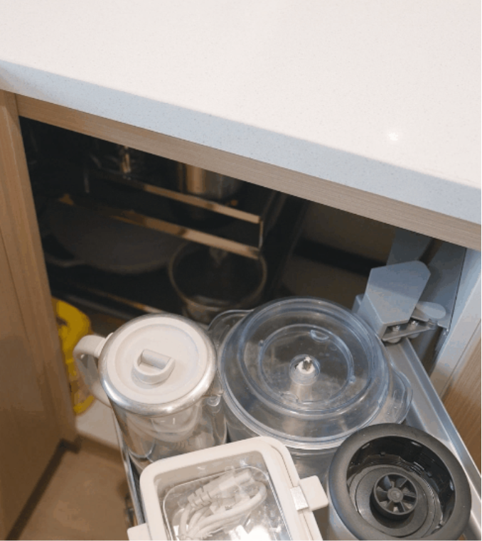 柜子轉(zhuǎn)角處物品拿取物品過于費力?配置拉籃一鍵解決,釋放廚房死角空間。