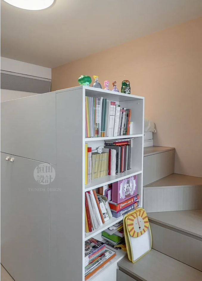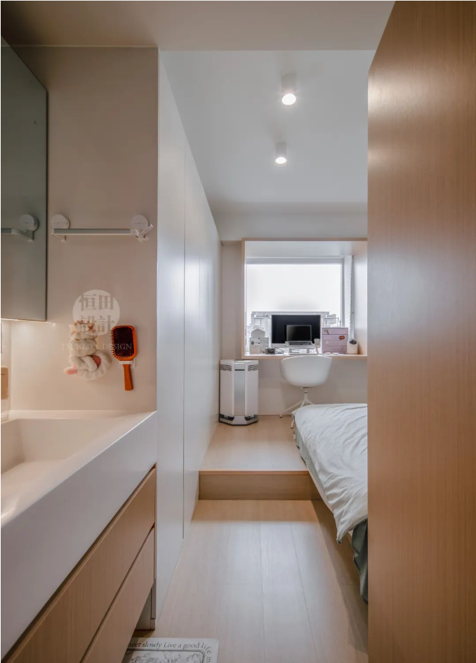 在這2.3m3的立面空間里,收納超乎想象。上方床、下方衣帽間、轉(zhuǎn)角處儲物抽屜,再加開放格書柜!嘎槿鸽m小,可五臟俱全」,落為現(xiàn)實。