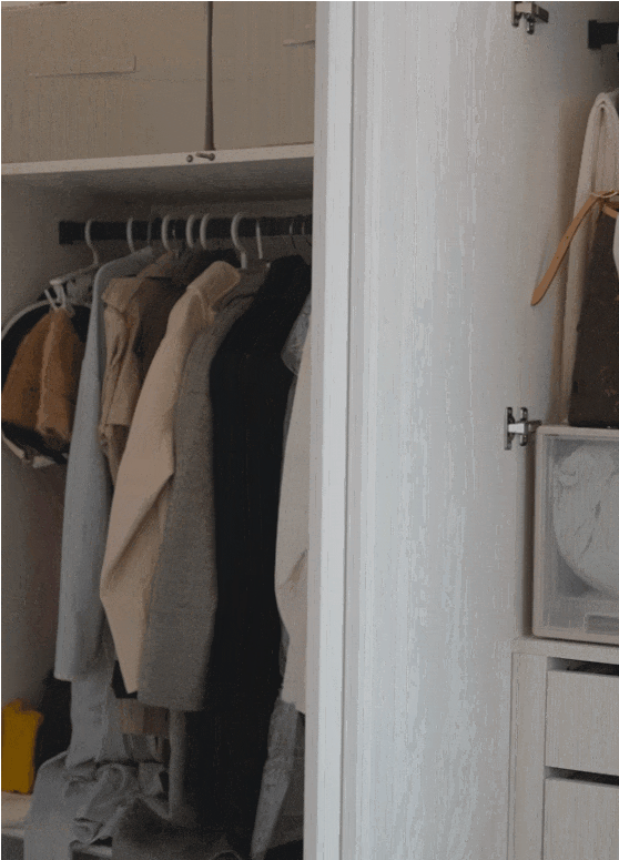 入戶處,沿墻精心打造了一條5.5米長的超薄鞋柜,巧妙劃分玄關落塵區(qū),專為鞋履與次凈衣物設計。柜內(nèi)層板高度可自由調(diào)節(jié),提升了儲物的靈活性與便利性。