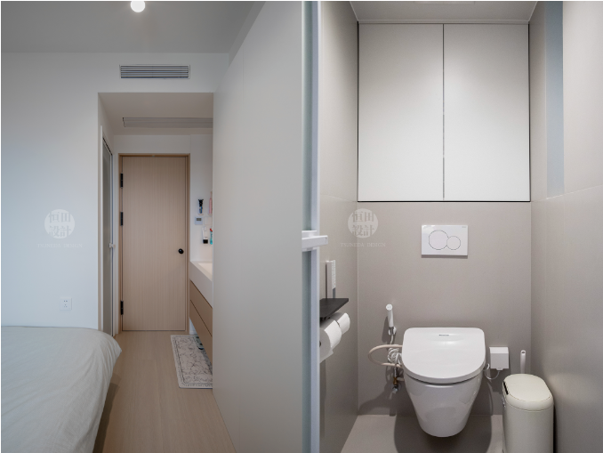 小主臥也能有獨立衛(wèi)生間。洗漱區(qū)外置,滿足日常洗漱。恭桶區(qū)內(nèi)采用油砂玻璃,盡可能借助自然采光。馬桶后留15cm薄柜,放些日用品最合適不過了。