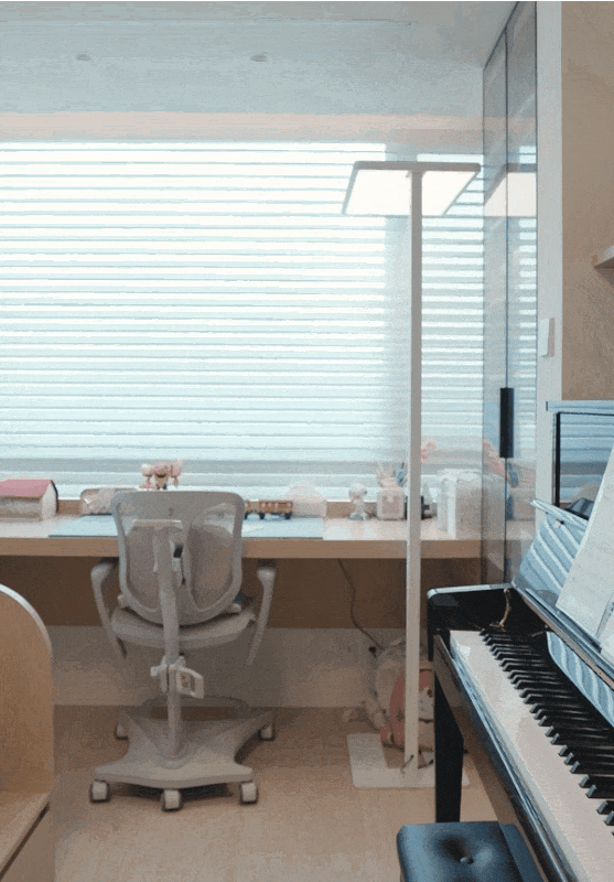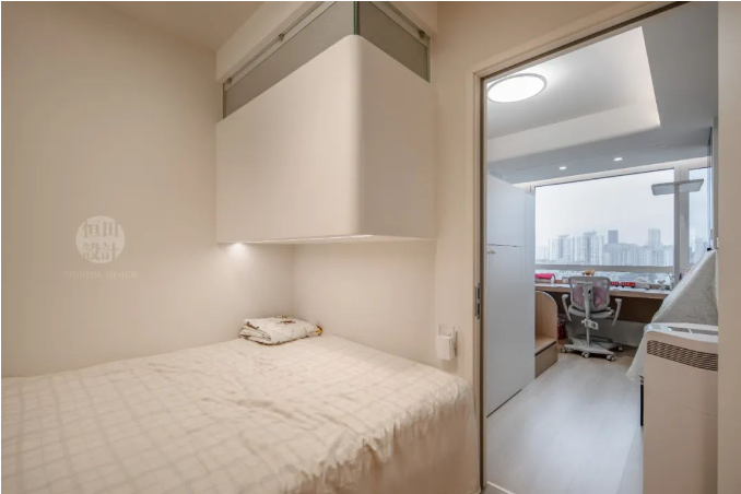 順著老人房,來到兒童房。靠窗的3m大長桌,家長可以坐在旁邊輔導作業(yè)。上方內(nèi)置隱藏晾衣架,孩子白天上學時,趁機晾晾衣物。