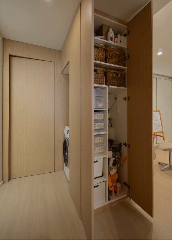 家政區(qū)位于全屋中心,清理房屋各處都十分方便。柜子內(nèi)部根據(jù)物品靈活布置,空間小更要細致規(guī)劃。