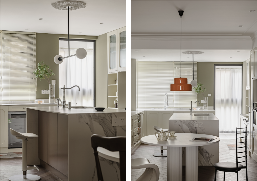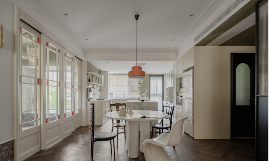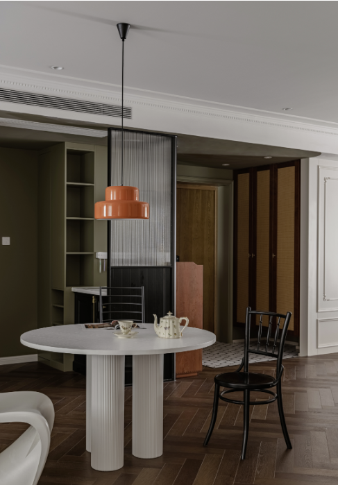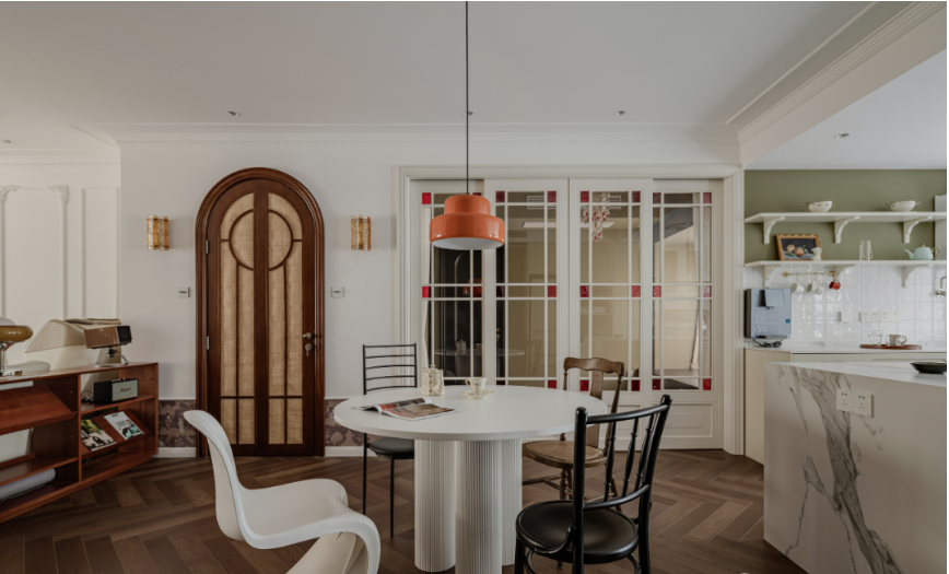 橙色吊燈和四把造型不一的椅子是屋主的選擇,既有中古風(fēng),也有現(xiàn)代簡(jiǎn)約風(fēng)。