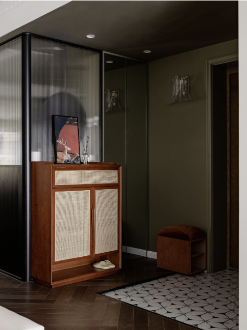 將玄關(guān)面積擴(kuò)大到2.78X1.73米,做了2X1.4米的落灰區(qū),進(jìn)門右手邊是換鞋凳、穿衣鏡,穿衣鏡打開是鞋柜,一個(gè)矮柜,放置室內(nèi)拖鞋。左手邊有3組鞋柜,下方留了25厘米的懸空,放置常穿的鞋子。