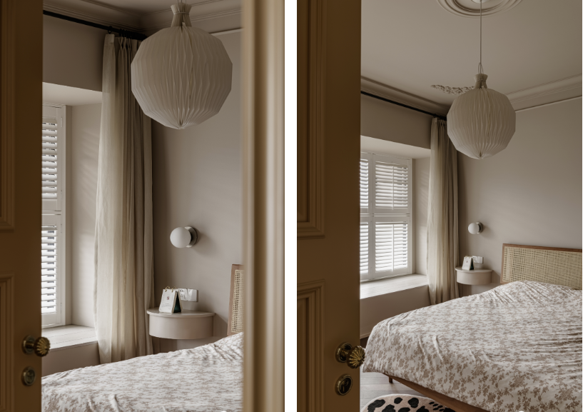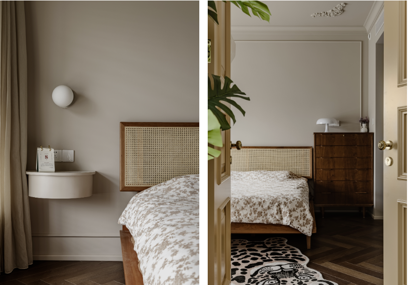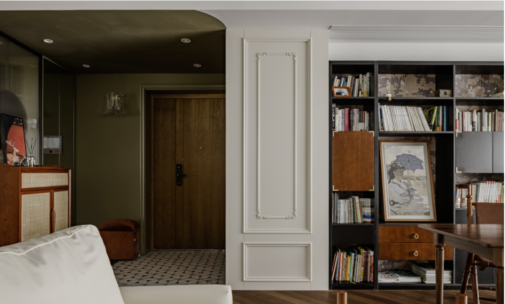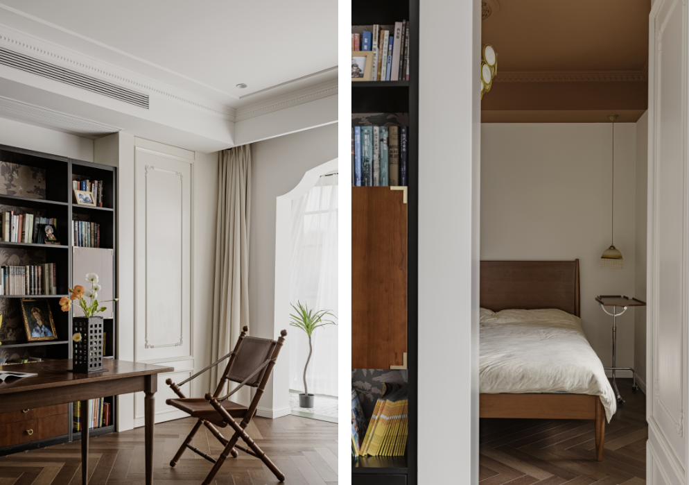 另一面墻做了細(xì)致的石膏線造型,自然嵌入臥室雙開門,底部是書架同款壁紙,50厘米高。