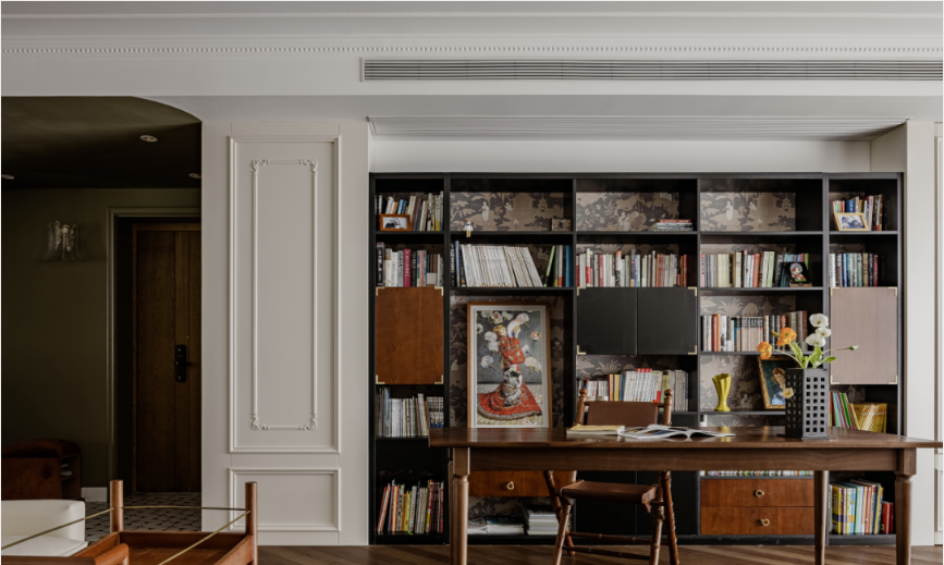 書桌背后的一面書架,近500本圖書,均可立放收納。實(shí)木折疊皮椅搭配1.8米長(zhǎng)的胡桃木長(zhǎng)桌,孩子的畫紙畫筆可以攤開來放,創(chuàng)意不被拘束。