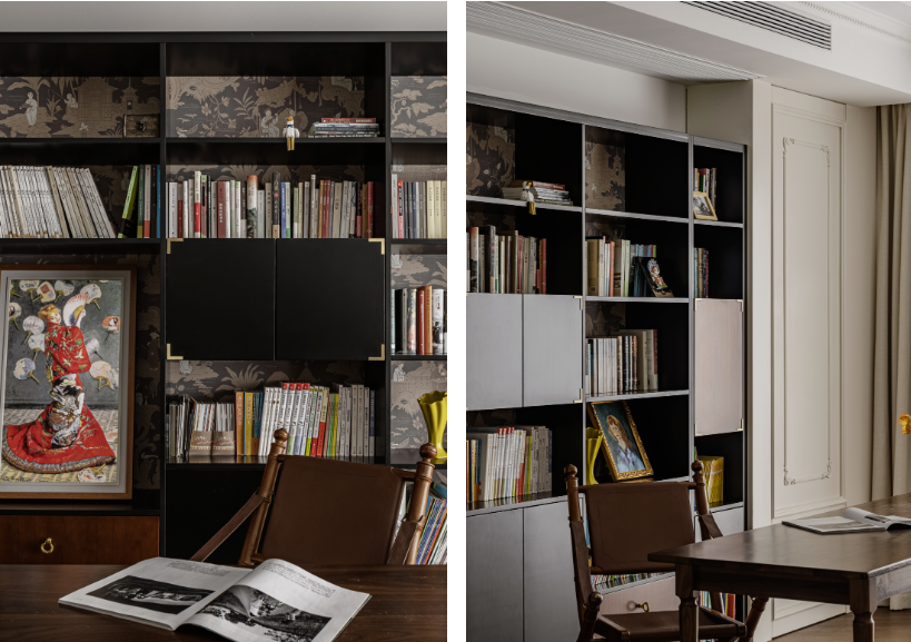 在外觀上,通過造型、材質(zhì)、色彩,讓書架不光容納書籍,也傳遞出這個(gè)家對(duì)于美的感知。 書架背景是定制的壁紙,黑底上,淺金色描繪出遠(yuǎn)東田園生活圖景,與書架本身的黑色柜身,金屬點(diǎn)綴呼應(yīng)。