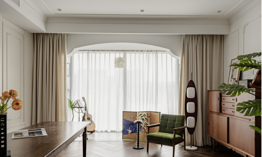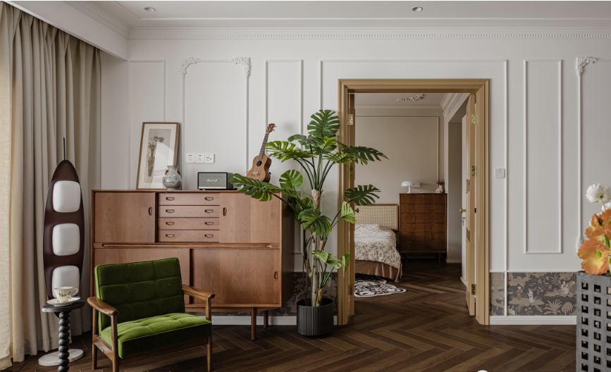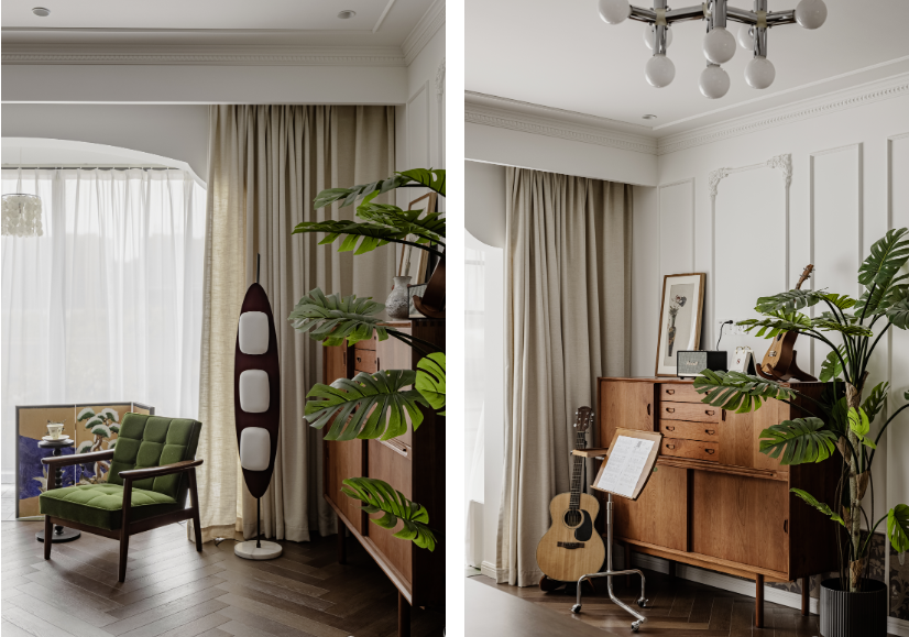 斗柜收納零碎物品,放把舒適的綠絨單人沙發(fā),配一盞帆船燈,或是擺上樂譜架,營(yíng)造一個(gè)悠然自得的音樂角落。