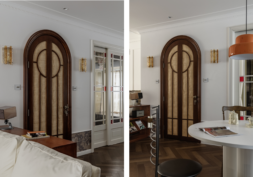 投影儀放在沙發(fā)后的雜物柜上。儲(chǔ)物間選擇藤編拱形門,搭配古銅把手,還有門兩側(cè)的兩盞橘色玻璃壁燈,復(fù)古且有著濃濃的異域風(fēng)情。