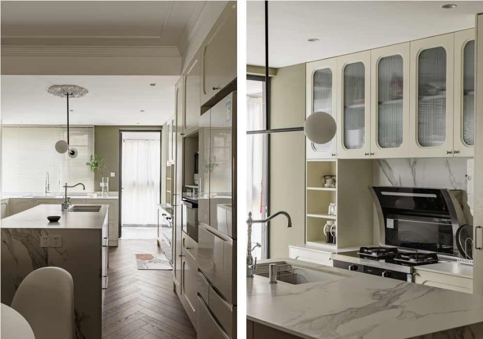 島臺(tái)兩側(cè)分別做平開柜、碗碟拉籃和鍋籃,分別應(yīng)對(duì)不同的使用場(chǎng)景。窗前設(shè)置第二組水槽,人多時(shí)可以多人同時(shí)備菜。