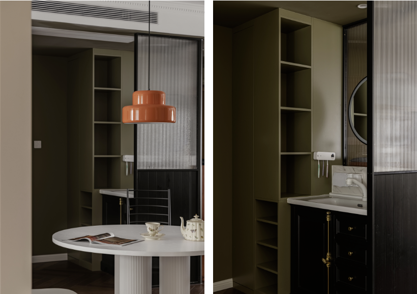 客衛(wèi)采用黑色和綠色的搭配,點(diǎn)綴精致的金屬配件,利用長(zhǎng)虹玻璃提升通透感,懸掛圓鏡,營(yíng)造出復(fù)古氛圍。