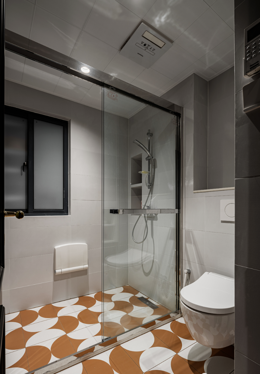 內(nèi)部設(shè)置淋浴,玻璃拉門做干濕分離,兩個(gè)壁龕用來收納洗浴用品。