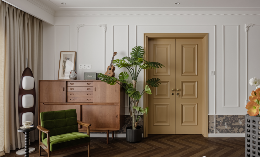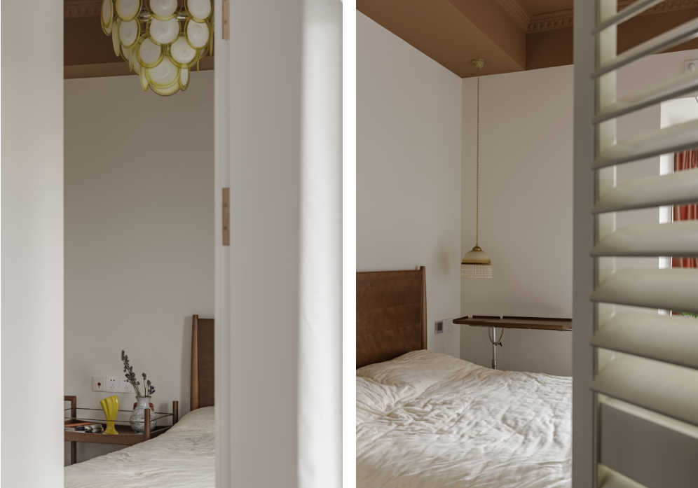 主臥用中古黃雙開門搭配金色南瓜把手,充滿儀式感,與客廳的南陽風(fēng)相得益彰。