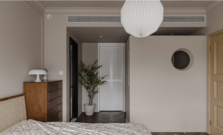 燈盤、角花、石膏線及踢腳線為同一色調(diào),這種低飽和度的色彩有陶土的溫柔細(xì)膩感,搭配曲線或直線造型效果都很不錯(cuò)。