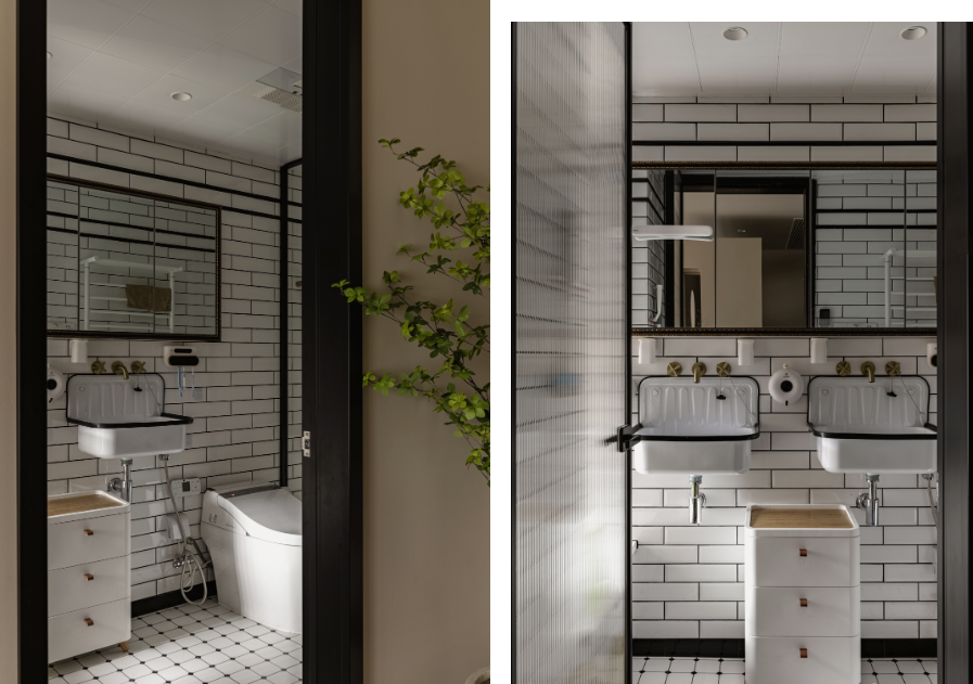 主衛(wèi)以黑白為主,地面為黑白花紋地磚,黑框玻璃后是個(gè)日式小浴缸。男主人有在早晨洗頭的習(xí)慣,設(shè)置雙臺(tái)盆,避免早上過度擁擠。
