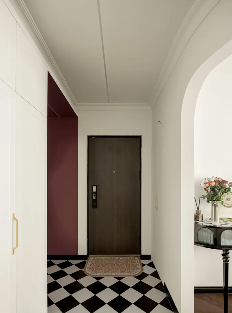 客廳與次臥對(duì)調(diào)后,形成獨(dú)立的玄關(guān)區(qū)域。左側(cè)則是暗藏的MINI玄關(guān)庫(kù),充分滿足了入戶空間收納的需求。黑白方磚將玄關(guān)與室內(nèi)區(qū)分開來,方便日常清潔。