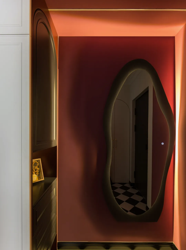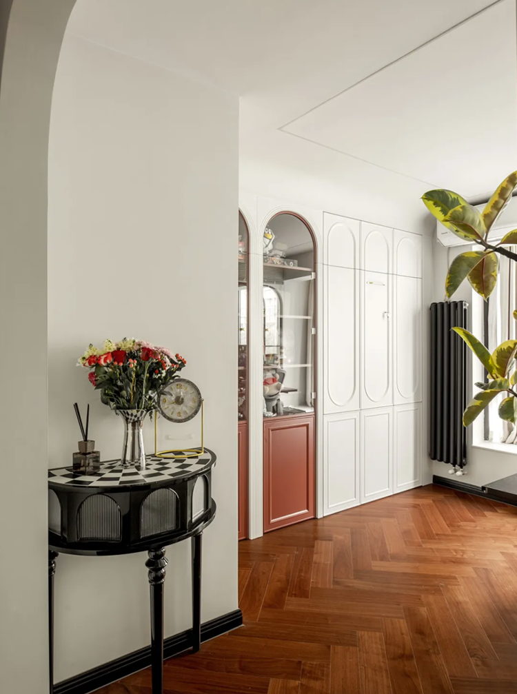 進(jìn)門右側(cè)凹?jí)κ褂昧藦?fù)古的紅色,韻味十足。一排雙向收納定制柜,正對(duì)大門的一側(cè)選用了跟墻面同色系的柜門色彩上更加和諧。