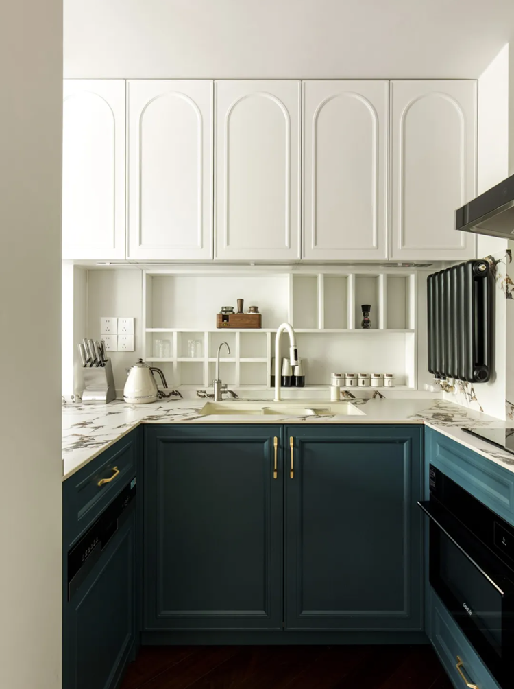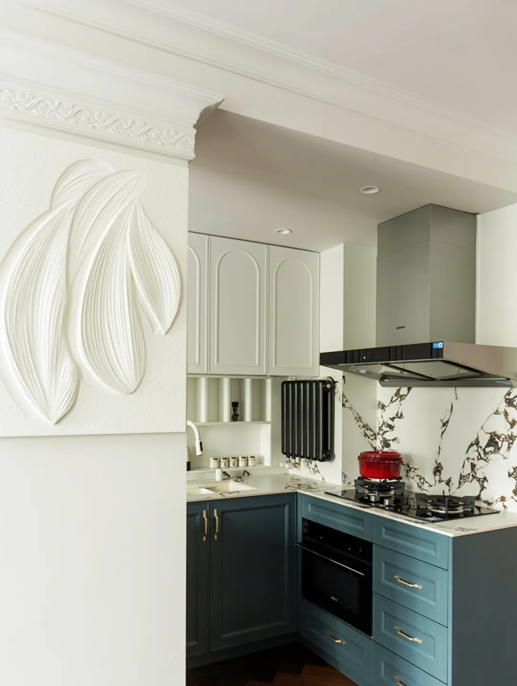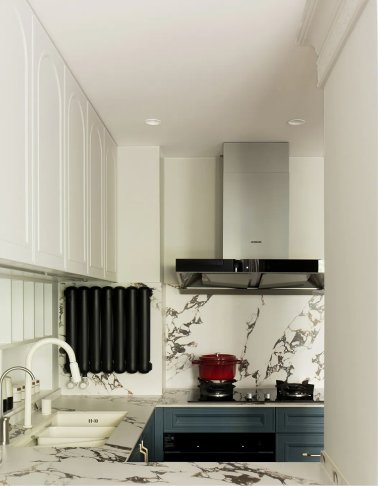 右側(cè)是烹飪區(qū),藍(lán)色櫥柜搭配寶格麗大理石臺(tái)面及墻面,高級(jí)感滿滿。