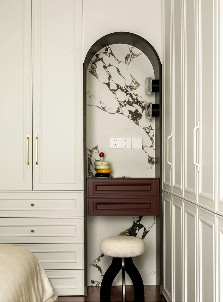 書房?jī)?nèi)做了一排定制柜,融入了拱形門元素,很法式。左側(cè)是書柜,右側(cè)則是儲(chǔ)物柜+墨菲床的設(shè)計(jì),實(shí)用又美觀。