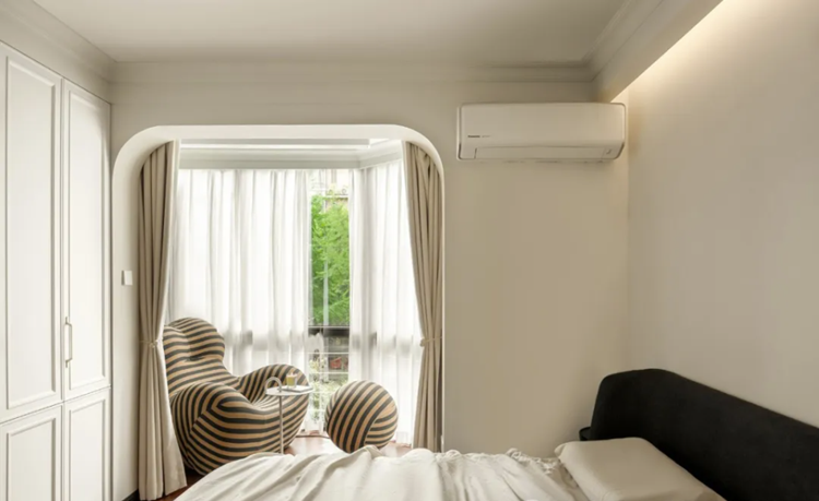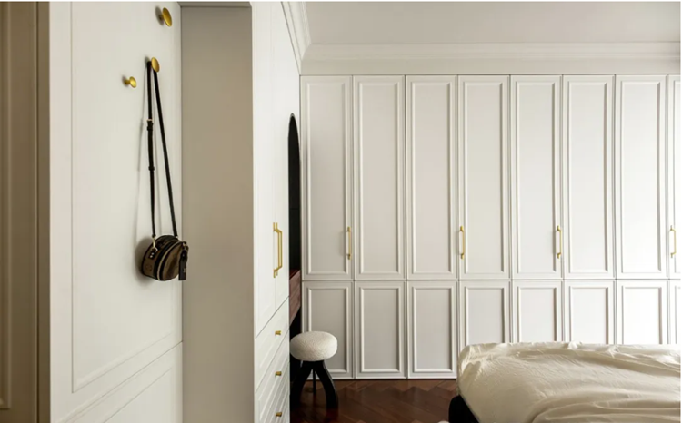 床尾是3.5米超長(zhǎng)衣柜,安裝了女主人喜歡的折疊推拉移門,內(nèi)部采用金屬壁掛。衣服多以懸掛為主,搭配可抽拉的收納盒,整體收納量驚人。